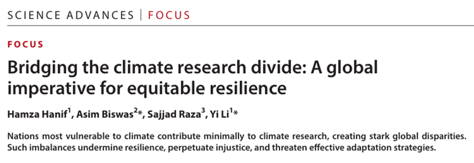Hamza Hanif, Asim Biswas, Sajjad Raza, Yi Li. Bridging the climate research divide: A global imperative for equitable resilience. Science Advances, 2025, 11, eadz0469